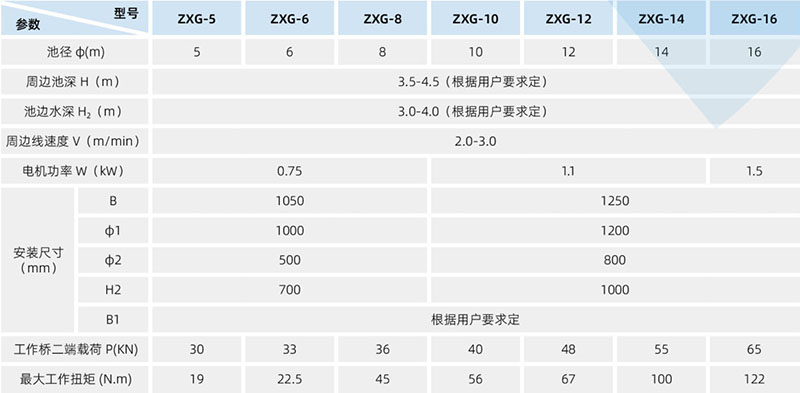 ZXG型中心傳動刮泥機,整臺刮泥機的載荷都作用在工作橋架的中心,由中心驅動機構帶動刮集泥裝置旋轉,定向刮板將沉淀池底的污泥刮集到中心集泥槽中,靠靜水壓力將其從污泥槽中排出,該機用于池徑較小的幅流式沉淀池。